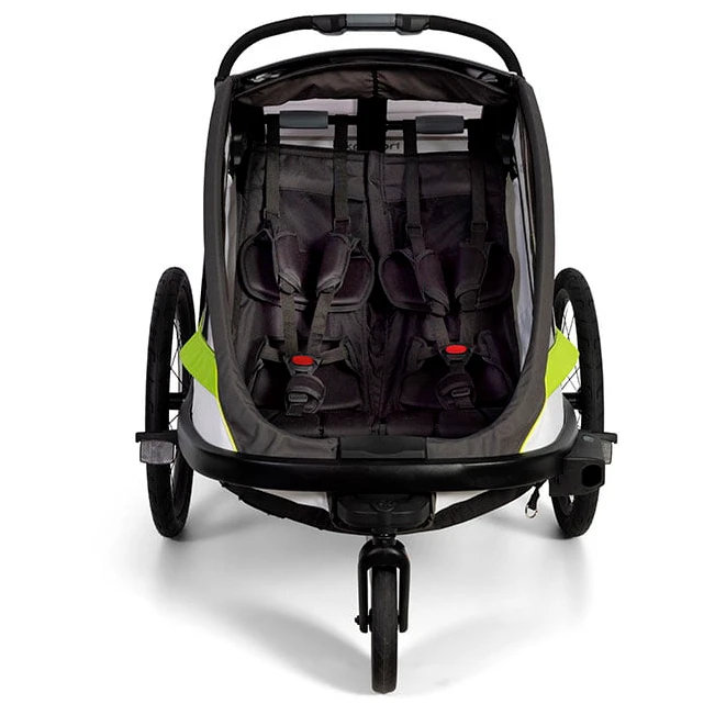 To make sure your kids are comfortable, the two seats have super soft seat padding. Plus, there is a 5-point harness to keep your children safe. Completed by a sun screen and rain cover, you’ll be well equipped for any weather.
